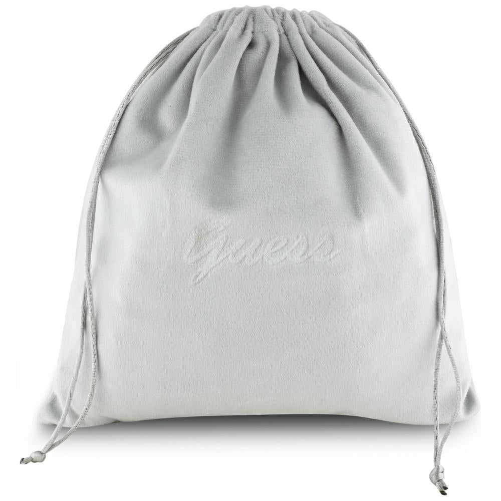 Die großzügige Ohrmuschel umschließt das Ohr, und der textile Einsatz kontrastiert absichtlich mit metallischen Einsätzen, die die GUESS-Signatur darstellen.