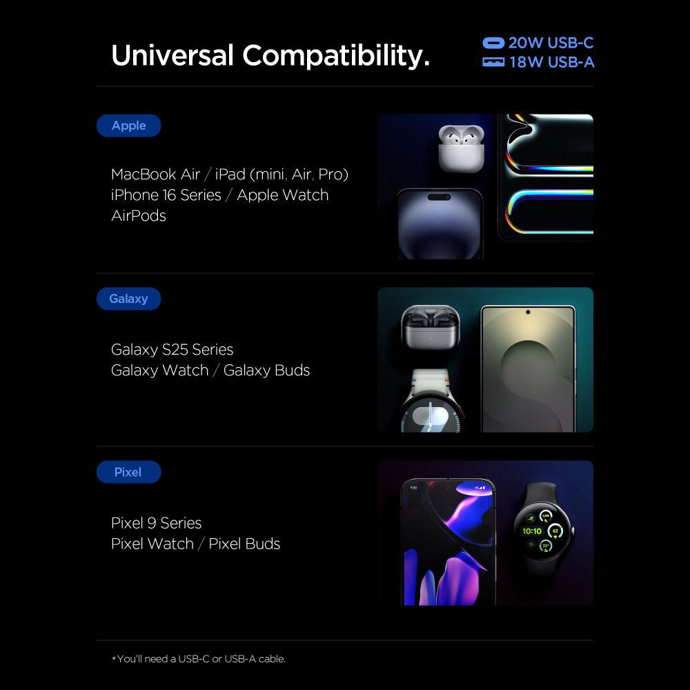 • Spigen integriert 2 separate Ports, sodass Sie gleichzeitig ein modernes Type-C-Gerät und ein kompatibles USB-Zubehör versorgen können.